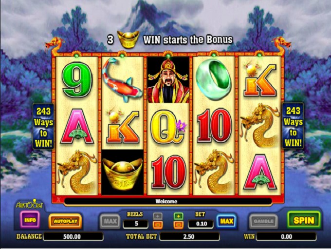 Choy Sun Doa online slot game by Aristocrat use playing card signs as low value symbols. Golden dragons, emerald rings and golden hats are count as high value ones. Golden dragon sign pays 1.000 coins, so watch out for that. Chinese dude portrait is wild symbol. Appears only on reels 2, 3 and 4. It substitutes for all other symbols except scatter. Scatter symbol is shown with a golden hat sign. 3 of them triggers a bonus round and gives you a list of choices: